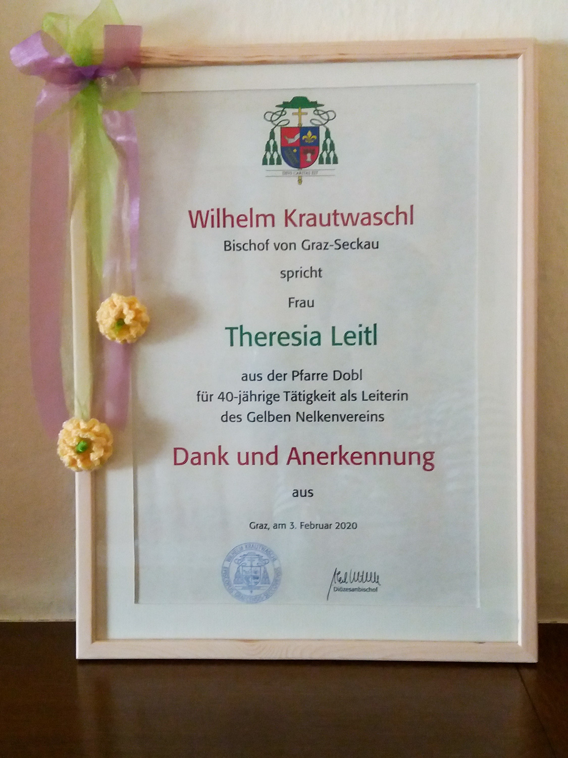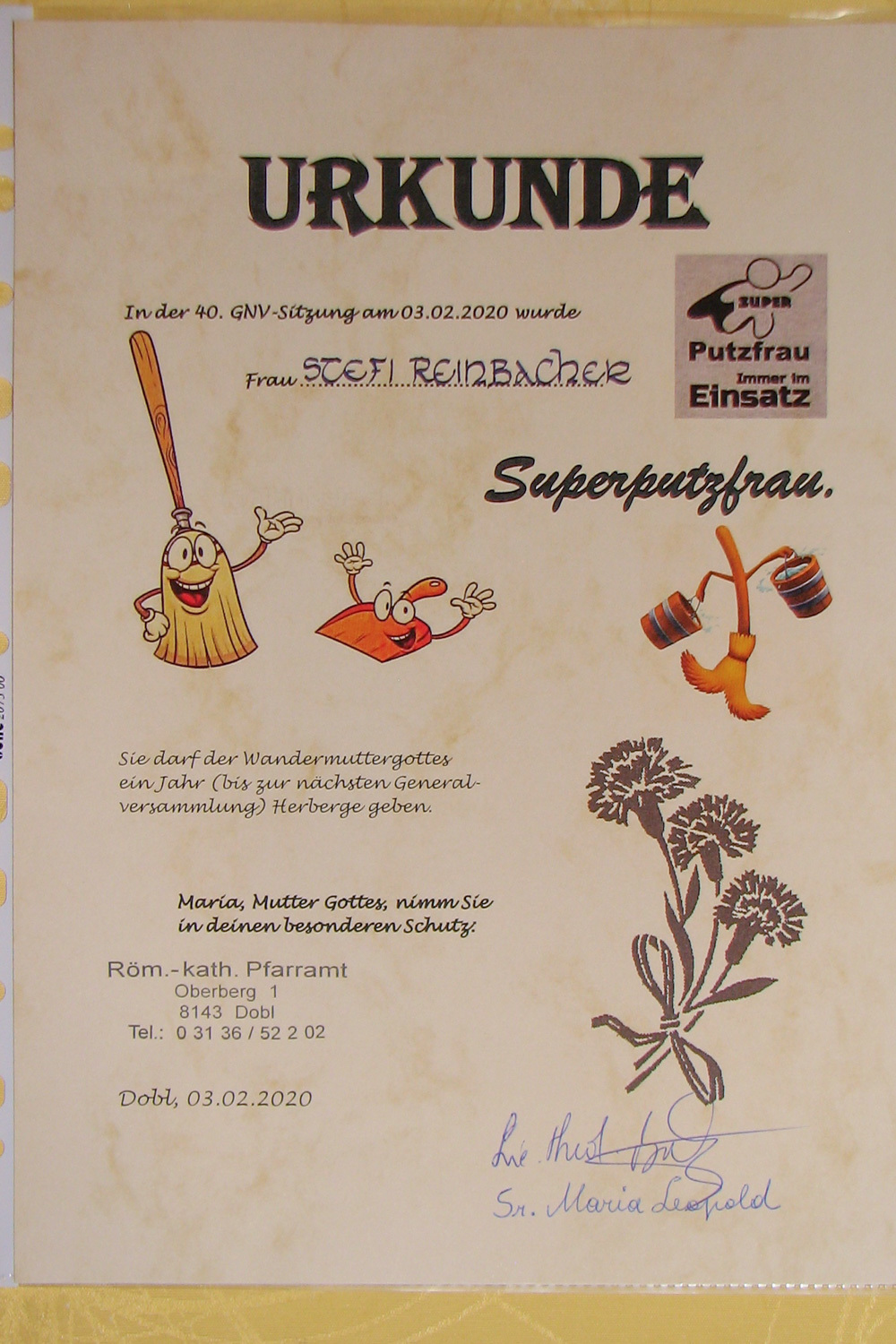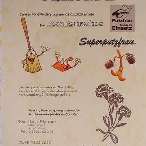 Durch Losziehung wurde Frau Steffi Reinbacher zur Superputzfrau des Jahres gekürt und erhielt die Wandermuttergottes für ein Jahr. Als Geschenke gab es für alle eine Broschüre mit Erklärungen von verschiedenen fremdsprachigen Küchenausdrucken, Süßigkeiten und ein Packerl mit Wäschekluppen.