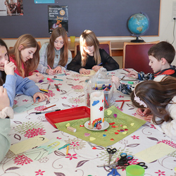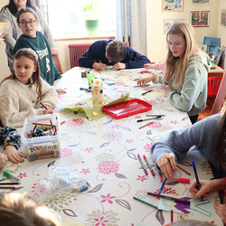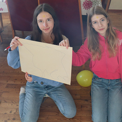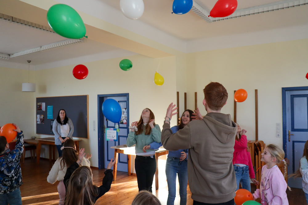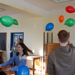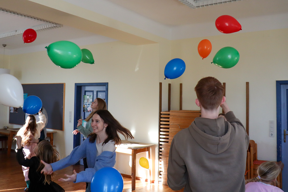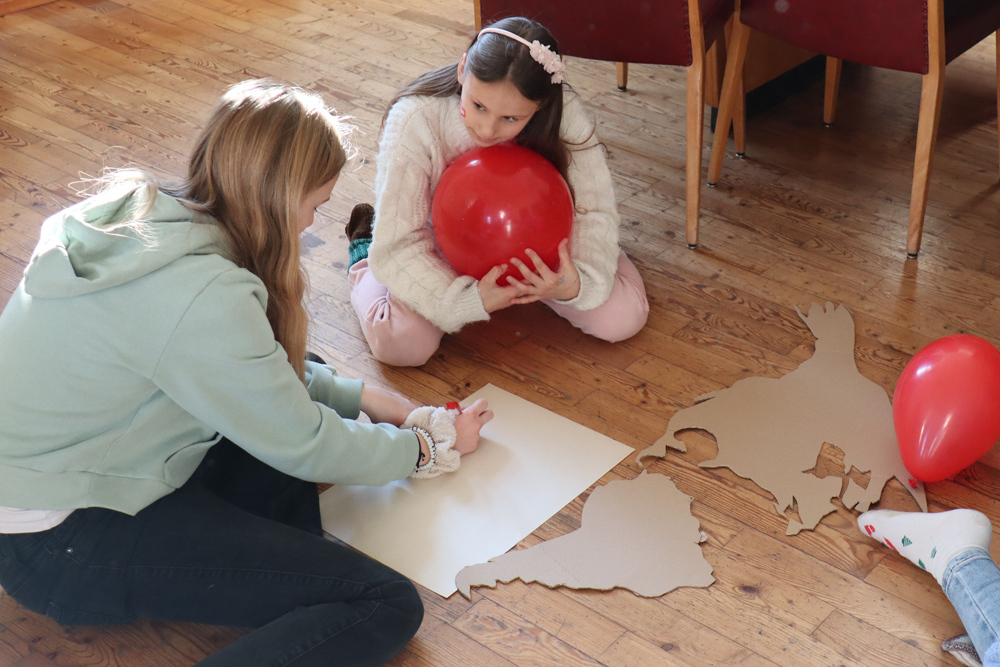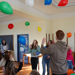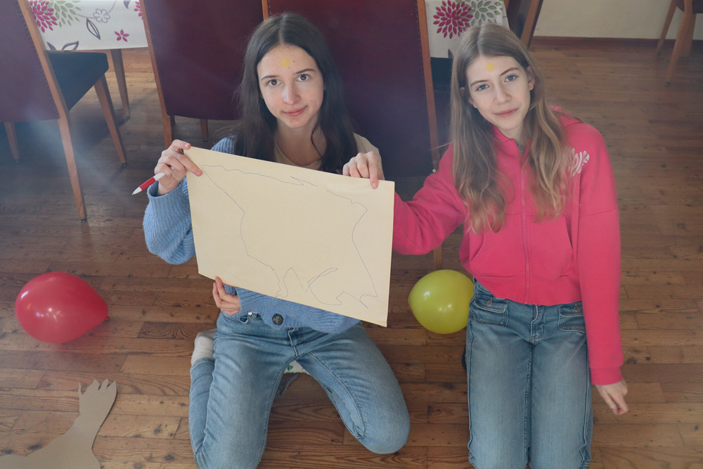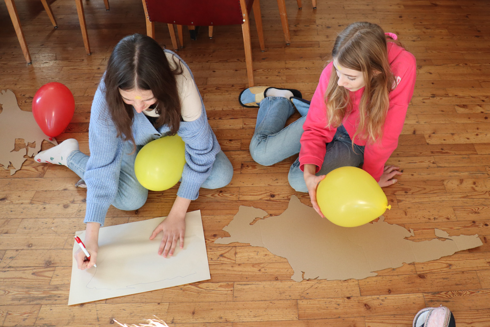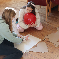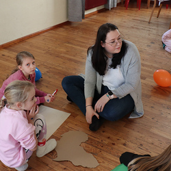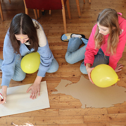 Als Zeichen der Vielfalt begannen wir nach einer kurzen Einführung mit vielen bunten Luftballons und spielten Versteinern. Jede Farbe stand für einen Kontinent. Am Ende des Spiels fingen alle einen Ballon, und bildeten so ihr Kontinent-Team, in welchem sie blind ihren Kontinent zeichneten. Bevor es zu einer Jausenpause kam, lernten wir noch „Gute Nacht“ in jeweils einer Sprache pro Kontinent.