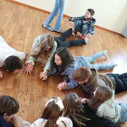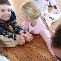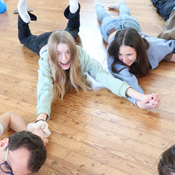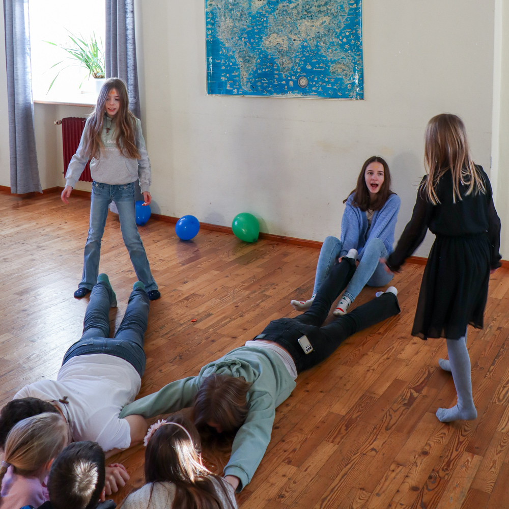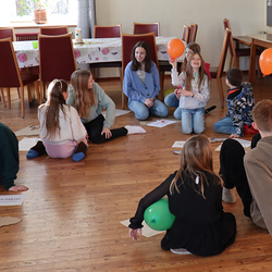 Anschließend überlegte sich das Team jedes Kontinents etwas, was die Menschen auf ihrem Kontinent mit allen anderen Menschen gemeinsam haben und stellen das pantomimisch dar, während wir anderen versuchten, es zu erraten. Beim „Karotten ziehen“ erfuhren wir, wie wichtig, aber auch schwierig es manchmal sein kann, zusammenzuhalten. Abschließend gestalteten wir noch eine Menschenkette, um den Zusammenhalt unter allen Menschen der Erde zu symbolisieren. Diese ziert nun den Pfarrsaal.