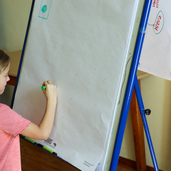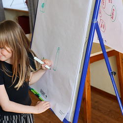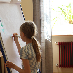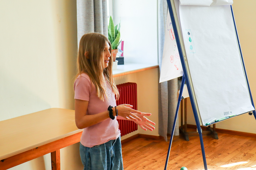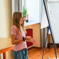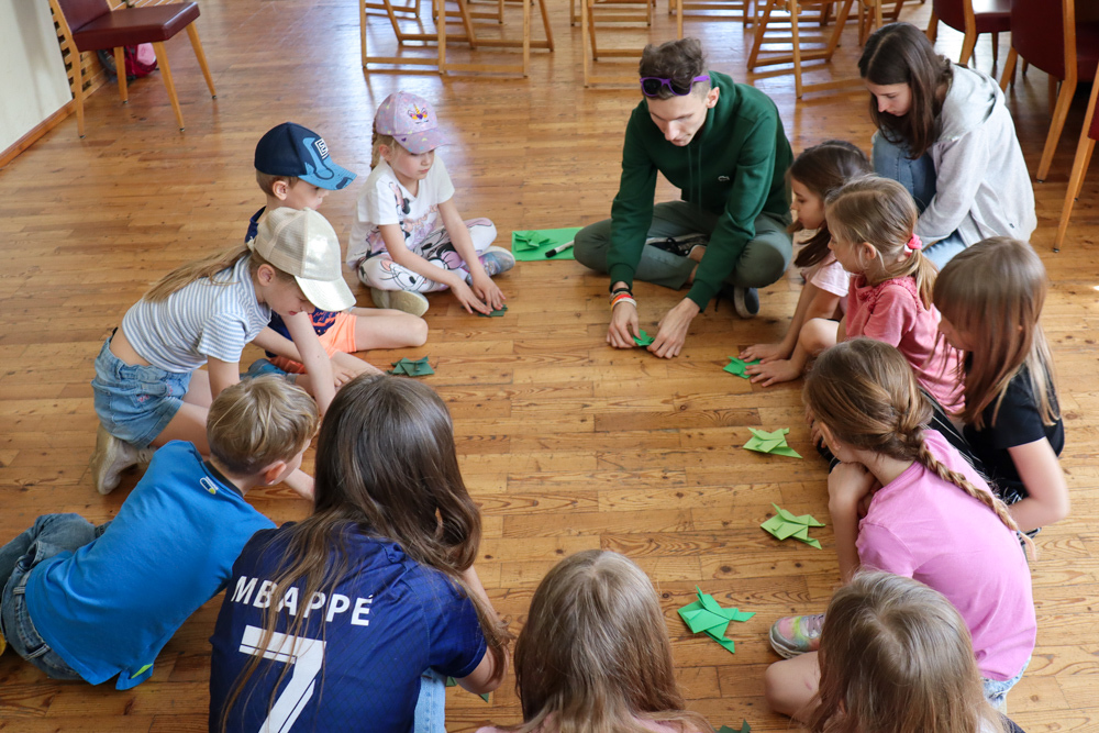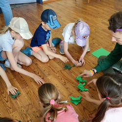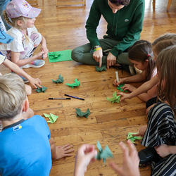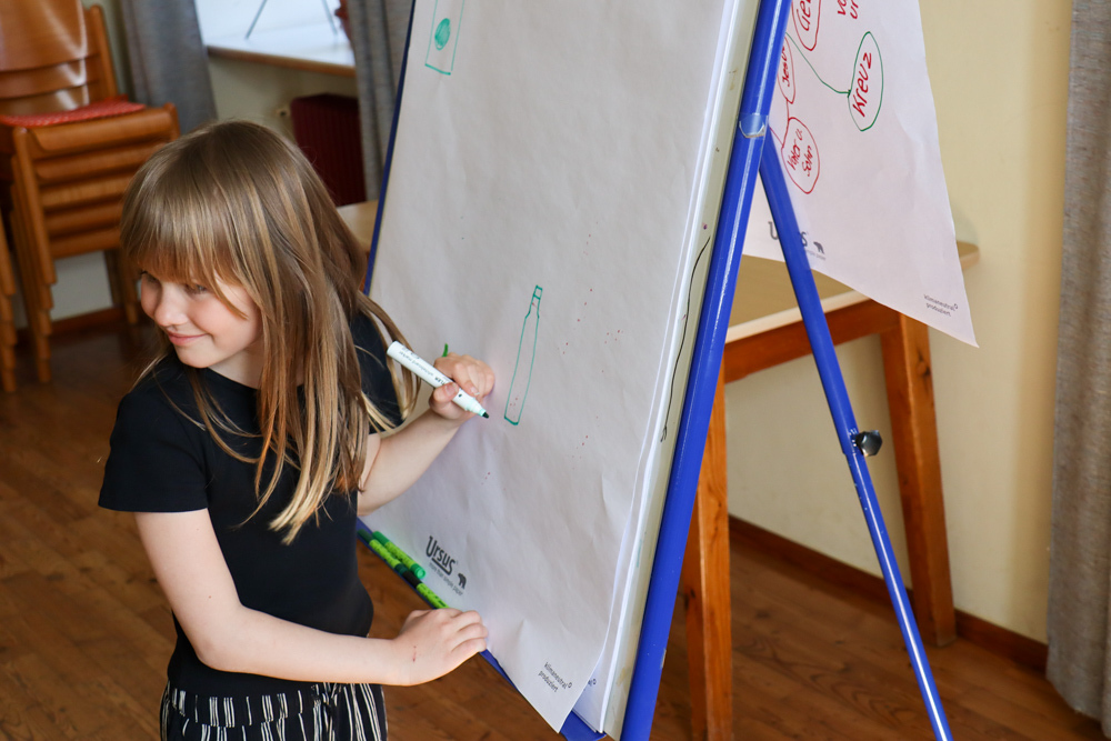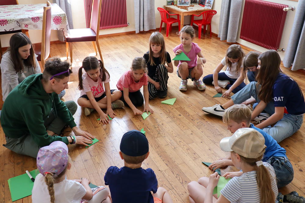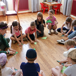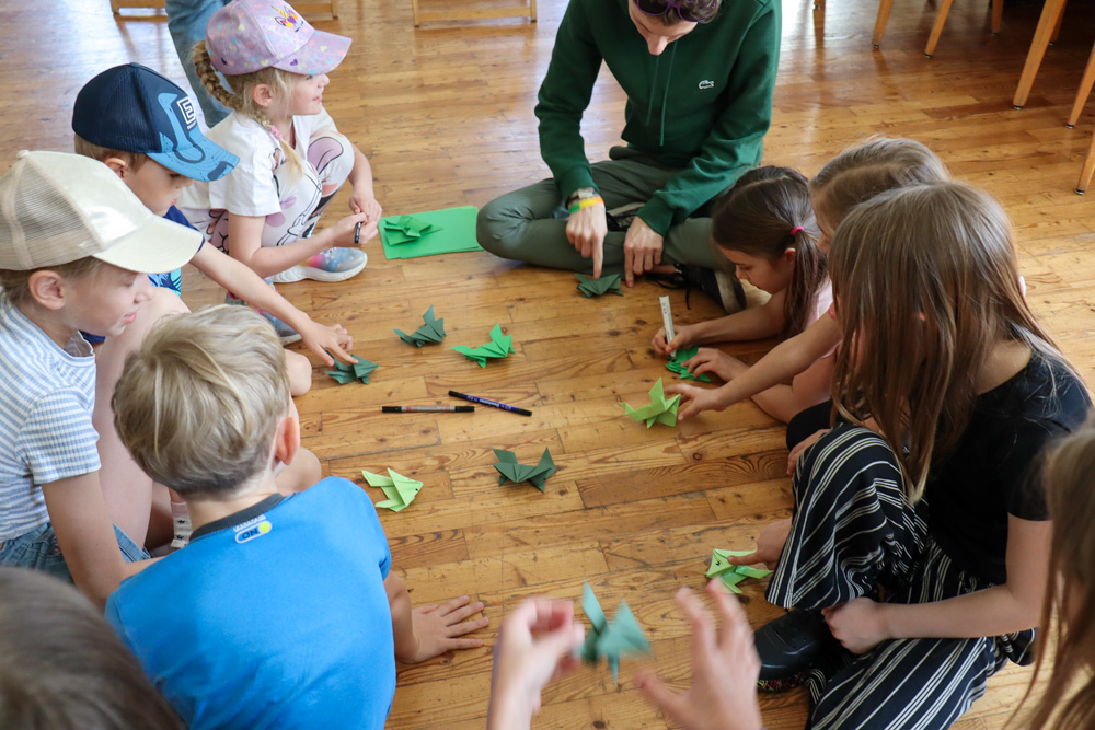 Anschließend spielten wir Activity mit lauter grünen Begriffen, wie zum Beispiel dem Kürbiskernöl oder der Gurke. Aus Papier falteten wir dann einen hüpfenden Frosch, bevor wir eine kurze Pause einlegten, in welcher wir grüne Äpfel aßen.