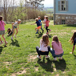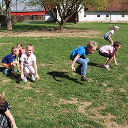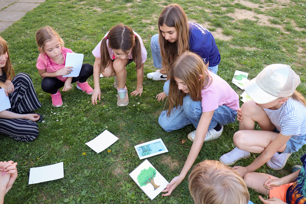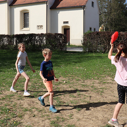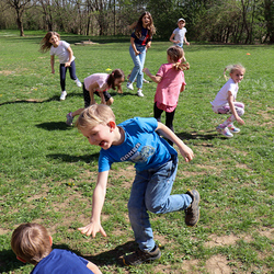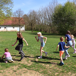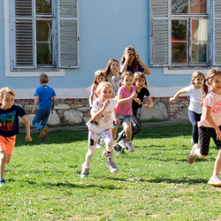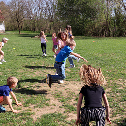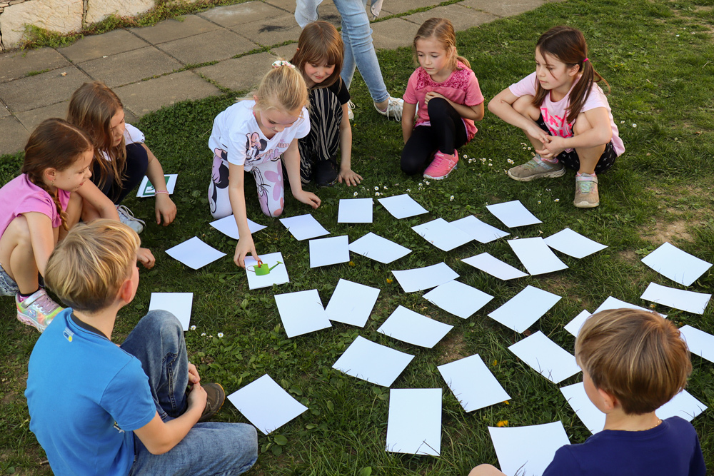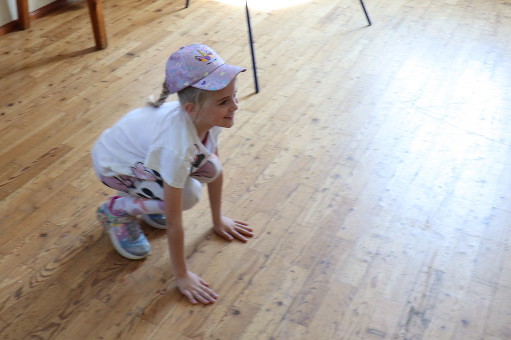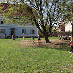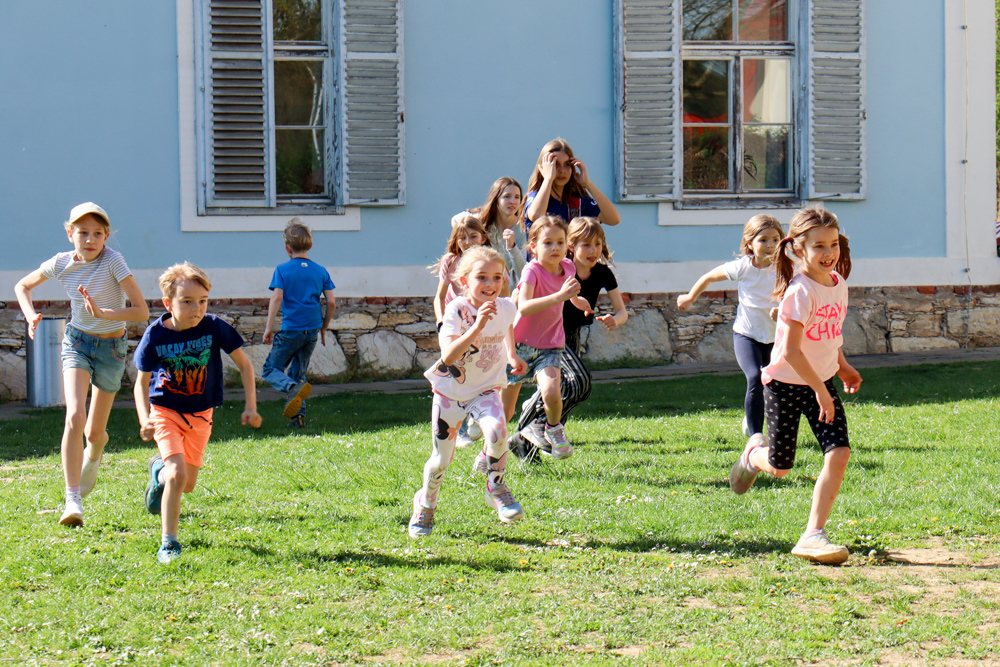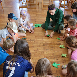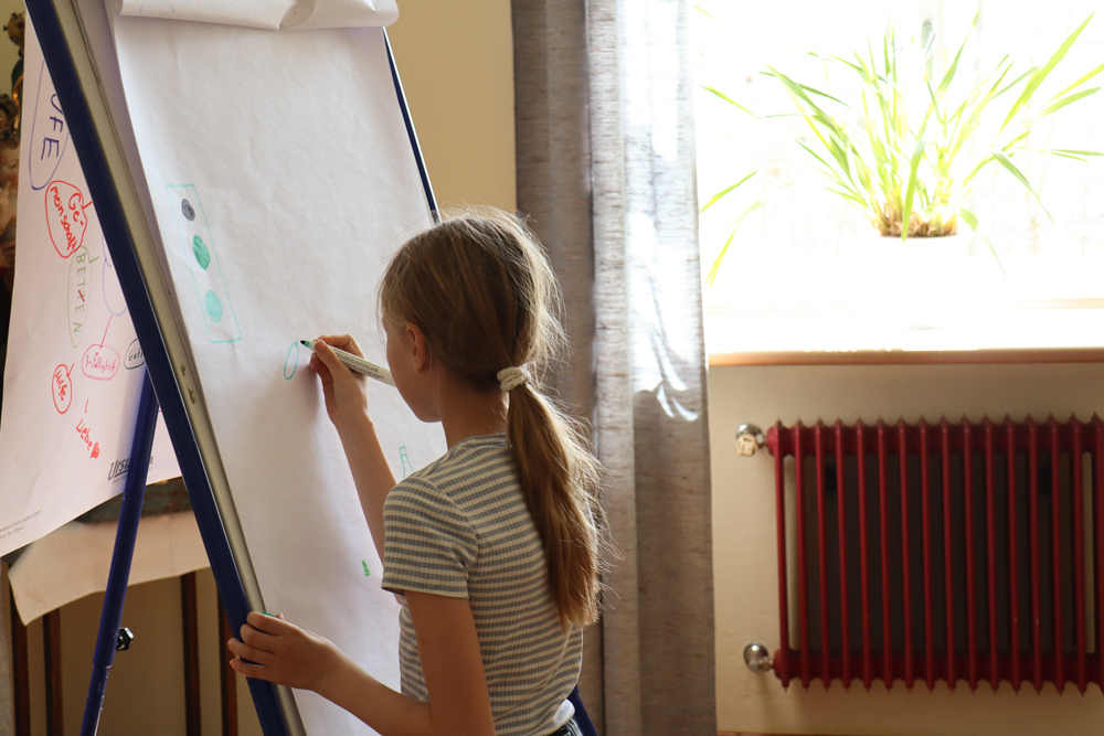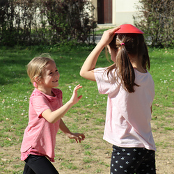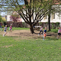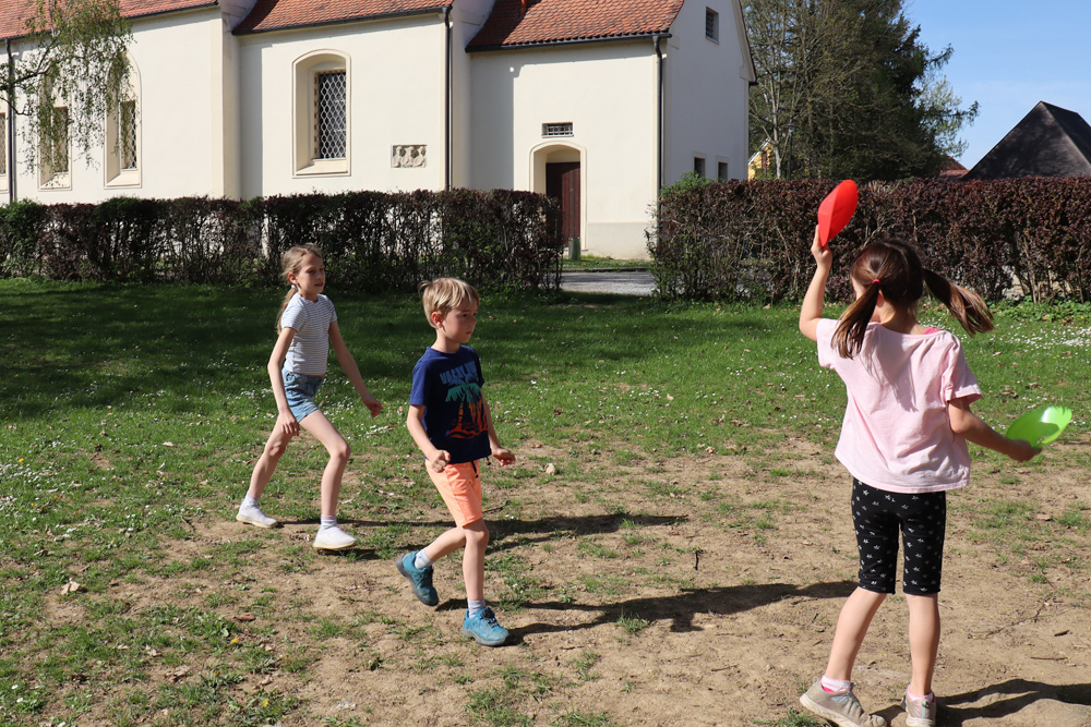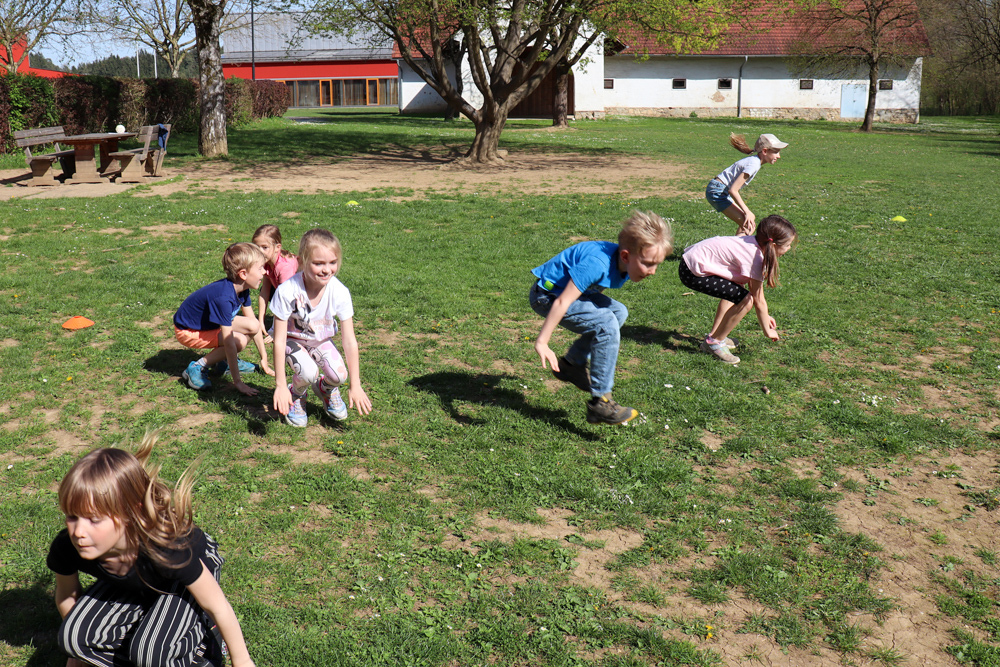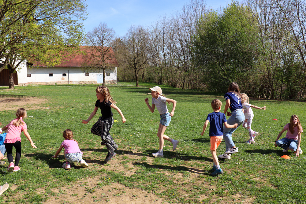 Frisch gestärkt gingen wir wieder nach draußen, um bei zwei Bewegungsspielen unserer Energie freien Lauf zu lassen: Zuerst wurden die zahlreichen Frösche vom Storch gejagt, und anschließend liefen alle auf eine Ampel zu, welche immer wieder unvorhersehbar von Grün auf Rot umschaltete.