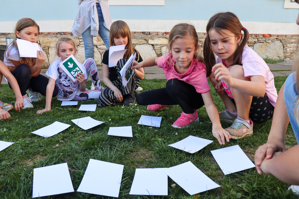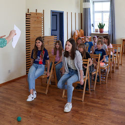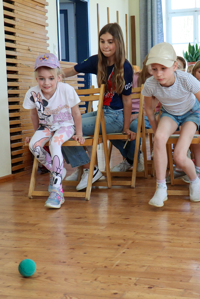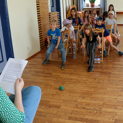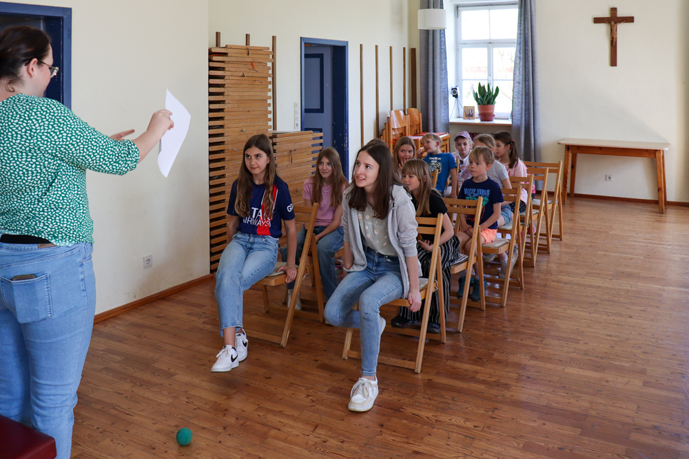 Nach dem Jungscharruf und einer kurzen Vorstellungsrunde im Freien wechselten wir in den Pfarrsaal und hörten von Lydia einiges über die Farbe Grün. Und jedes Mal, wenn das Wort „Grün“ fiel, mussten die beiden Ersten einer Zweierreihe versuchen, den grünen Ball zu berühren.