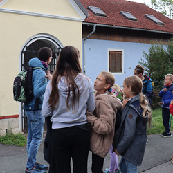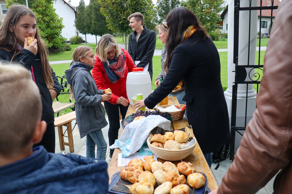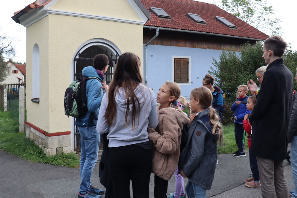 Bei der Dobl-Dorf-Kapelle angekommen, erzählte uns Bürgermeister a. D. Anton Weber einiges über die Kapelle, welche heuer ihr 170-Jahr-Jubiläum feiert. In der kurzen Wort-Gottes-Feier bei hörten wir auch eine Geschichte über das Geheimnis der Dankbarkeit, in der Bohnen eine wichtige Rolle spielen. Nach einem Psalm, den drei Kinder vorlasen, waren alle eingeladen, wunderbare Geschenke in die Kapelle zu legen, die sie am Weg fanden.