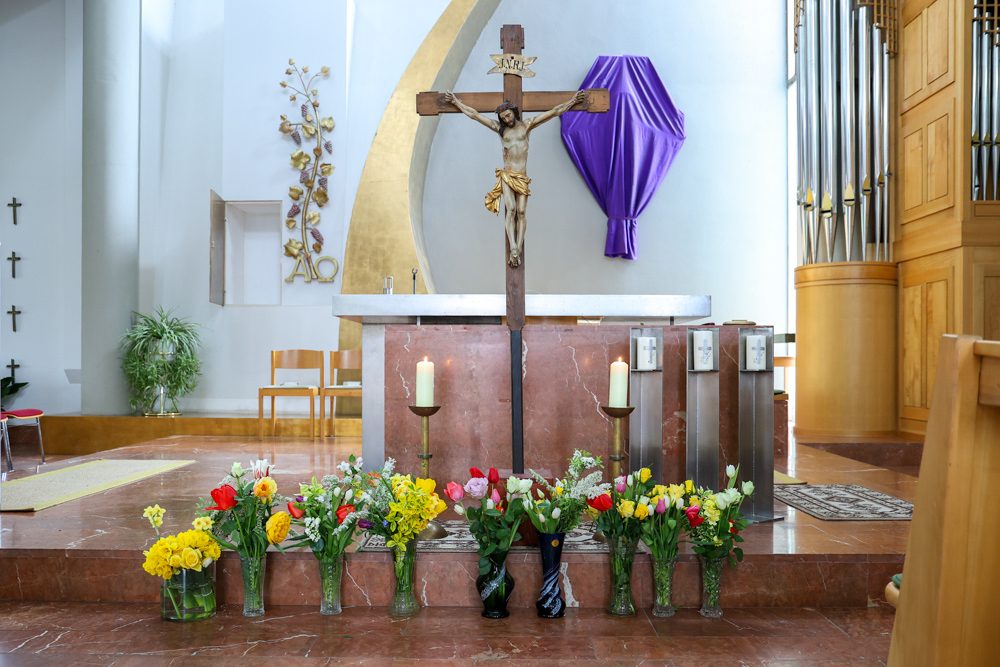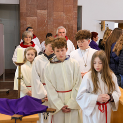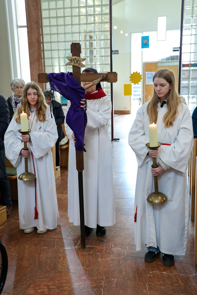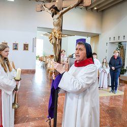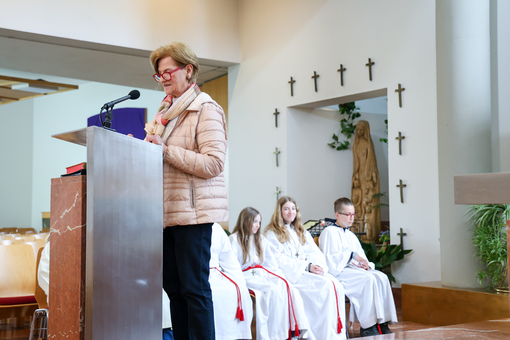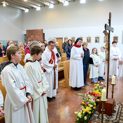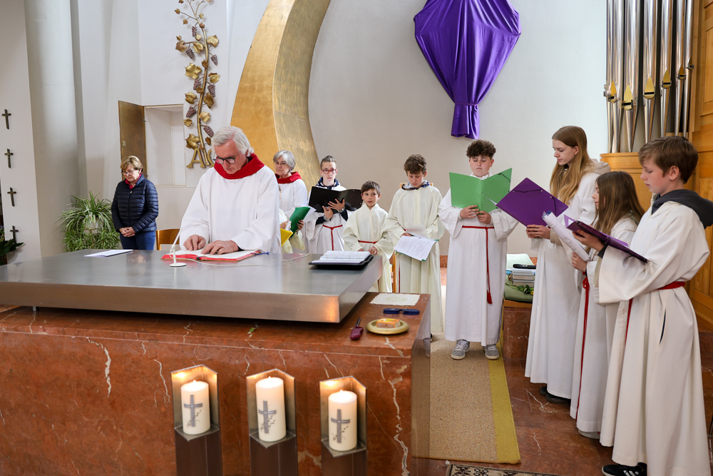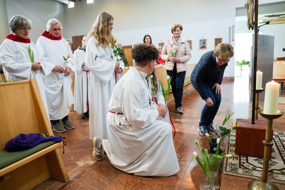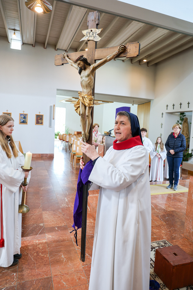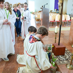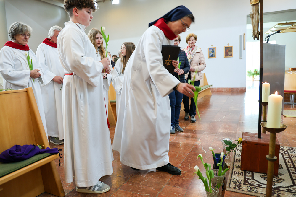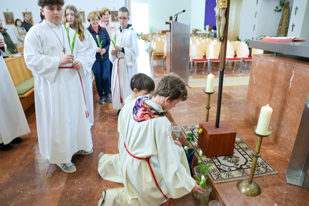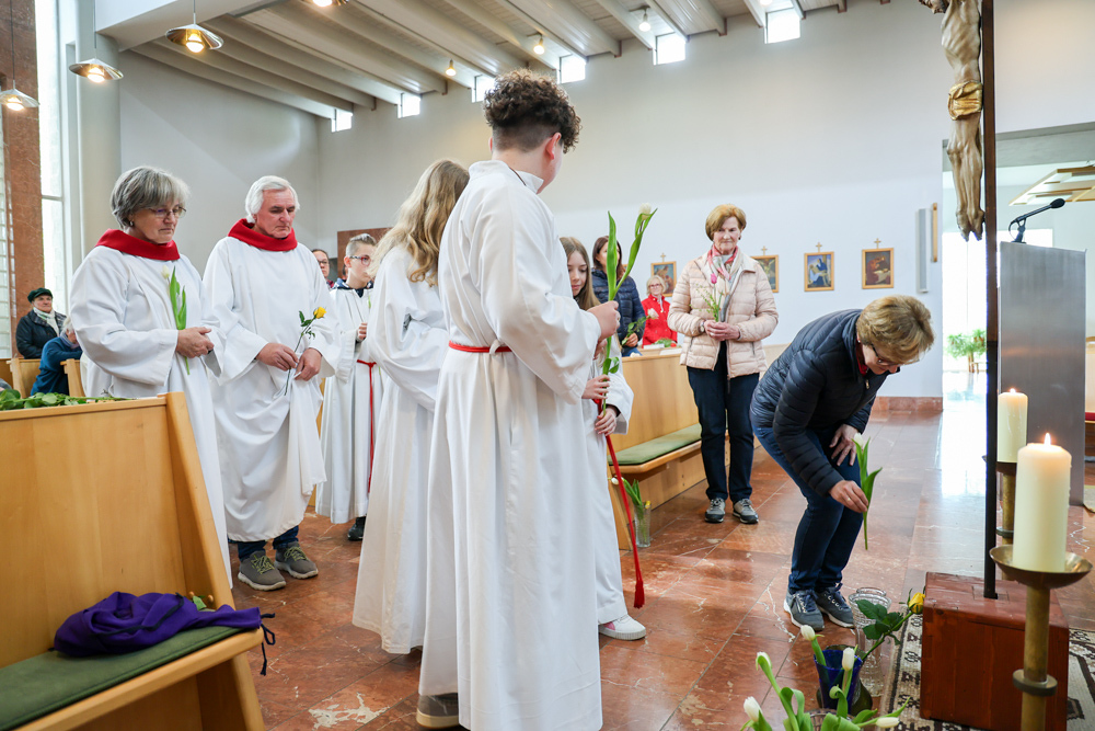 Die Leidensgeschichte wurde von den Ministrantinnen und Ministranten in verteilten Rollen gelesen. Nach der Enthüllung des Kreuzes waren alle eingeladen, dieses mit einer Kniebeuge und einer Blume zu verehren.