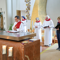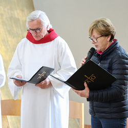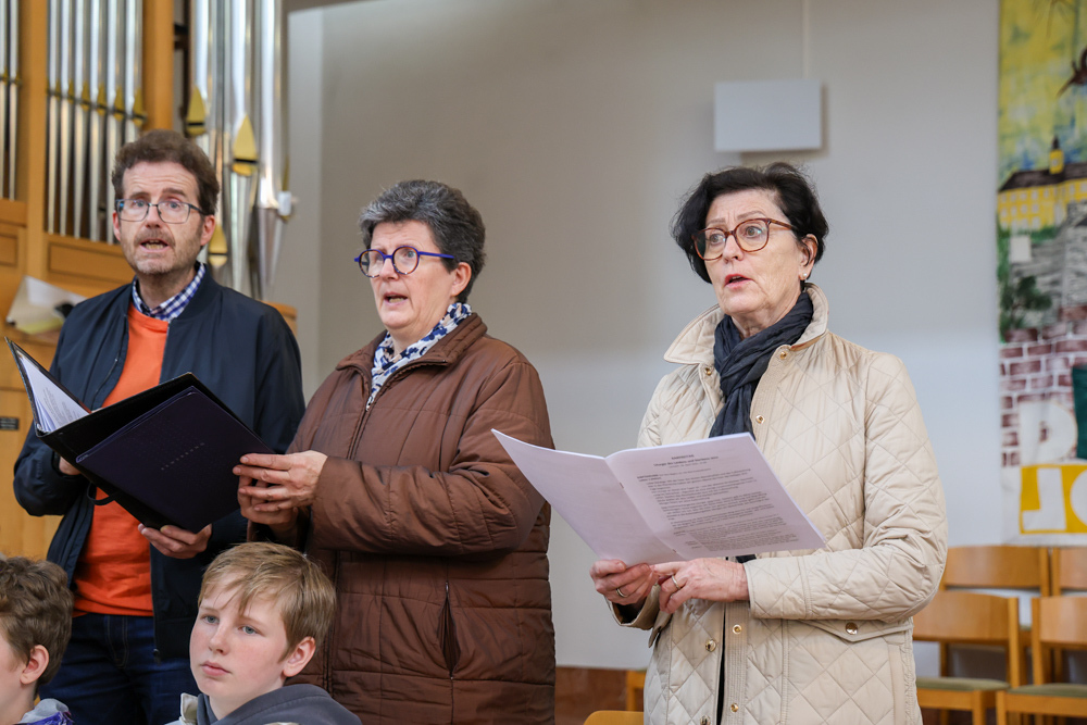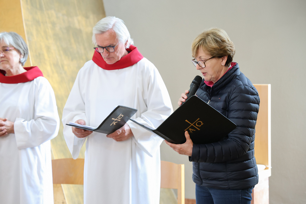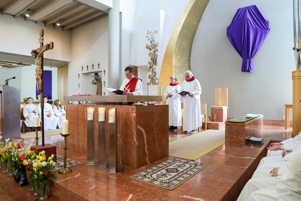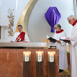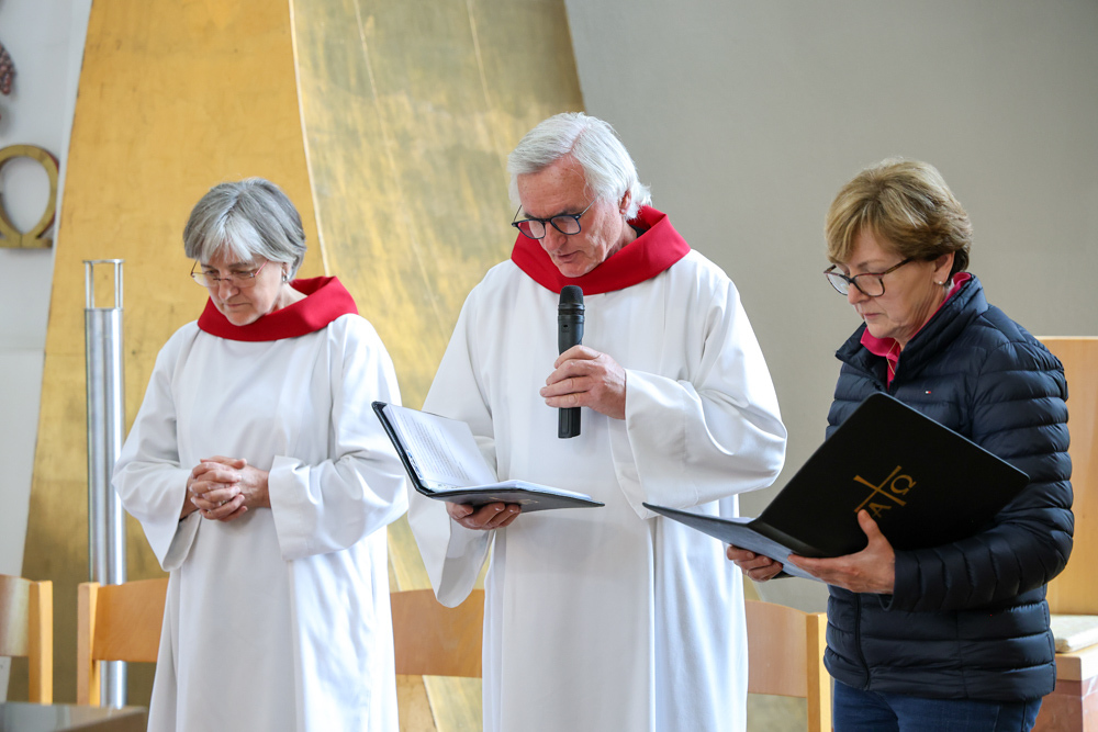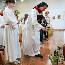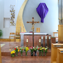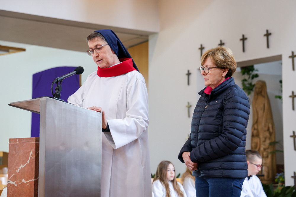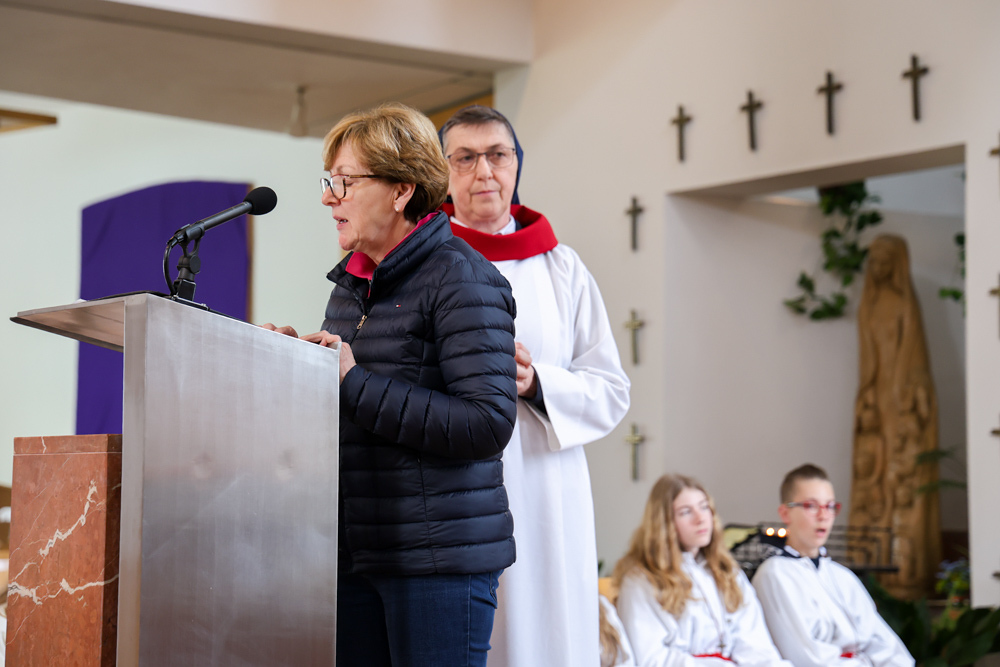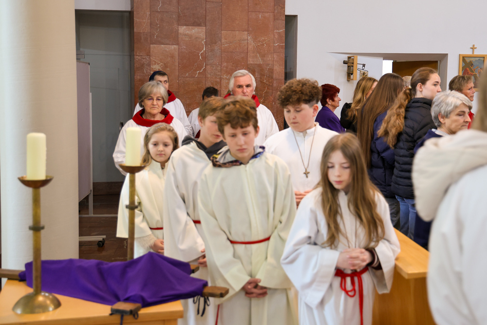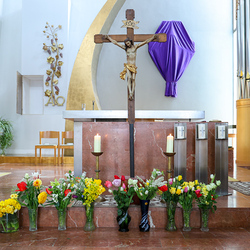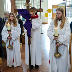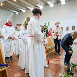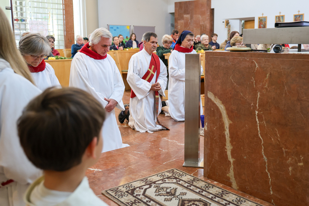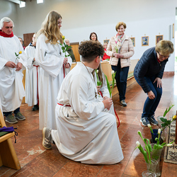 Die Leidensgeschichte wurde von den Ministrantinnen und Ministranten in verteilten Rollen gelesen. Nach der Enthüllung des Kreuzes waren alle eingeladen, dieses mit einer Kniebeuge und einer Blume zu verehren.