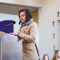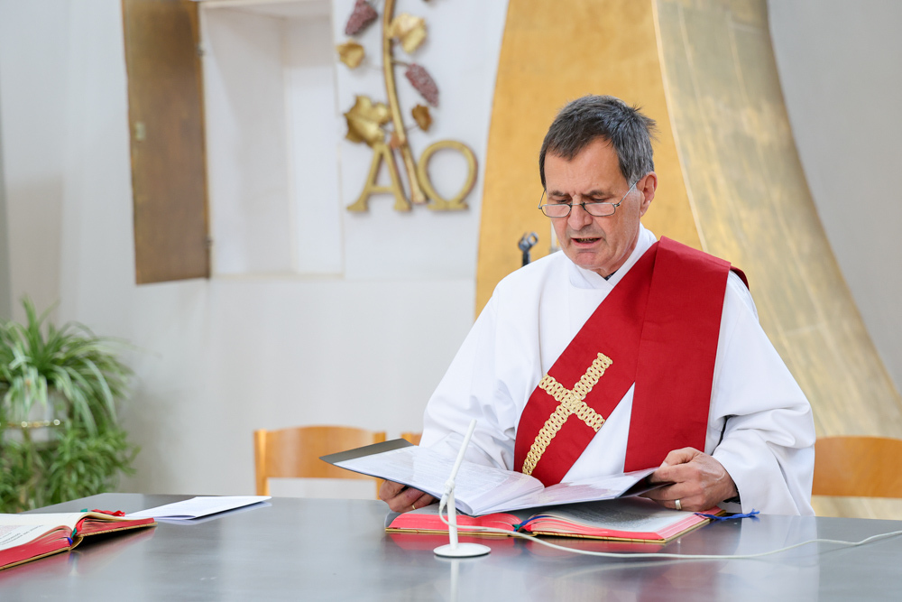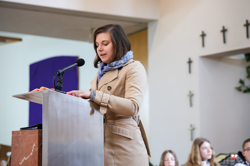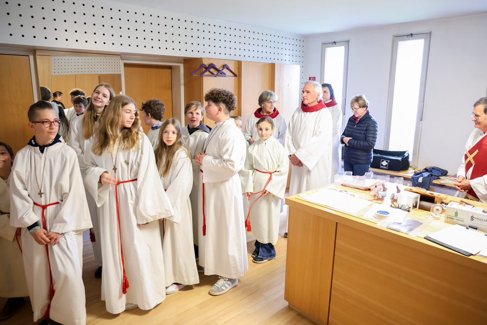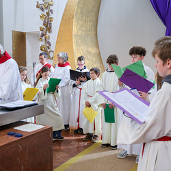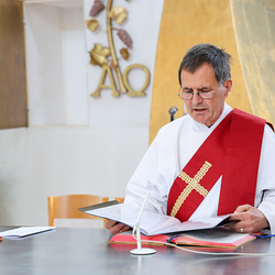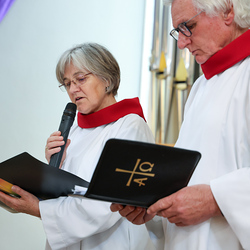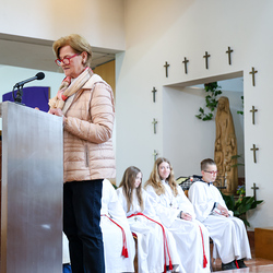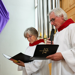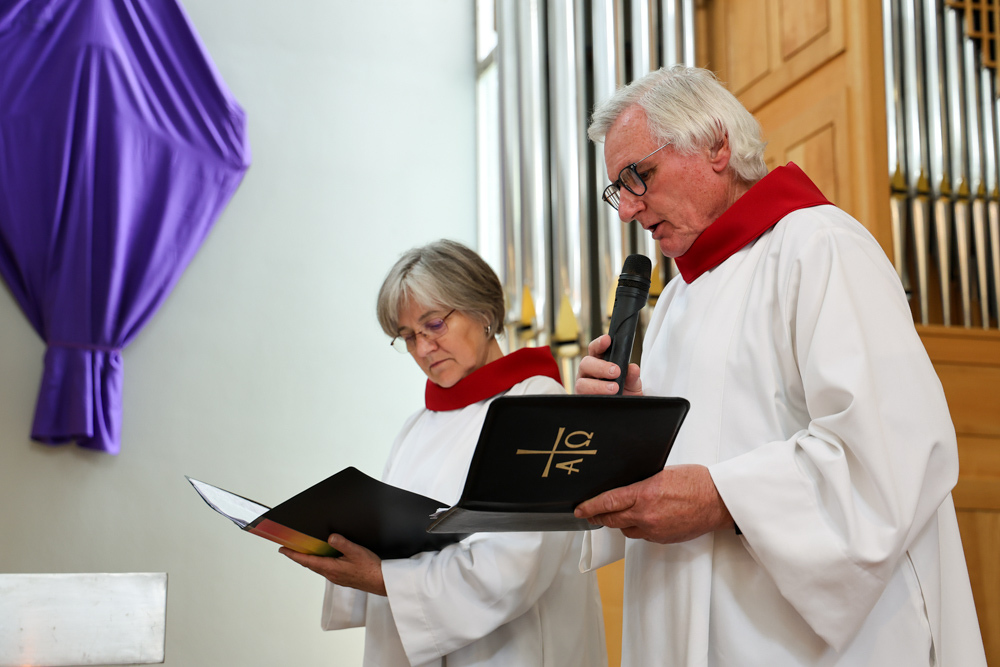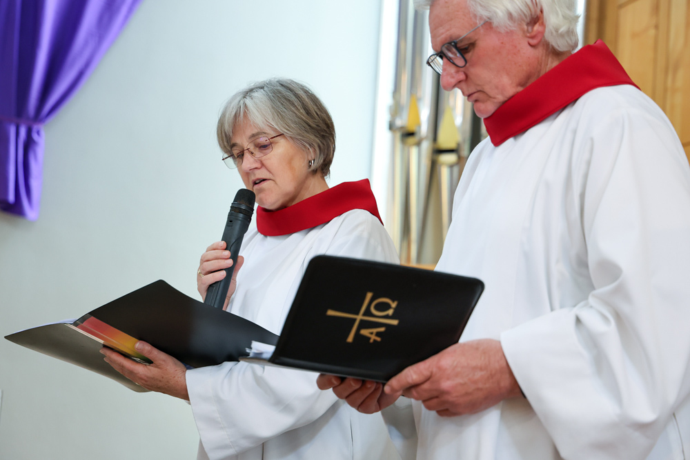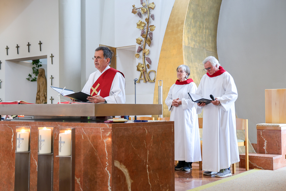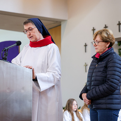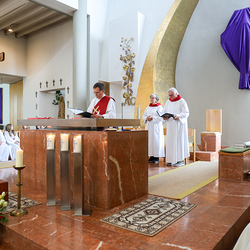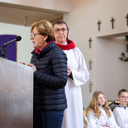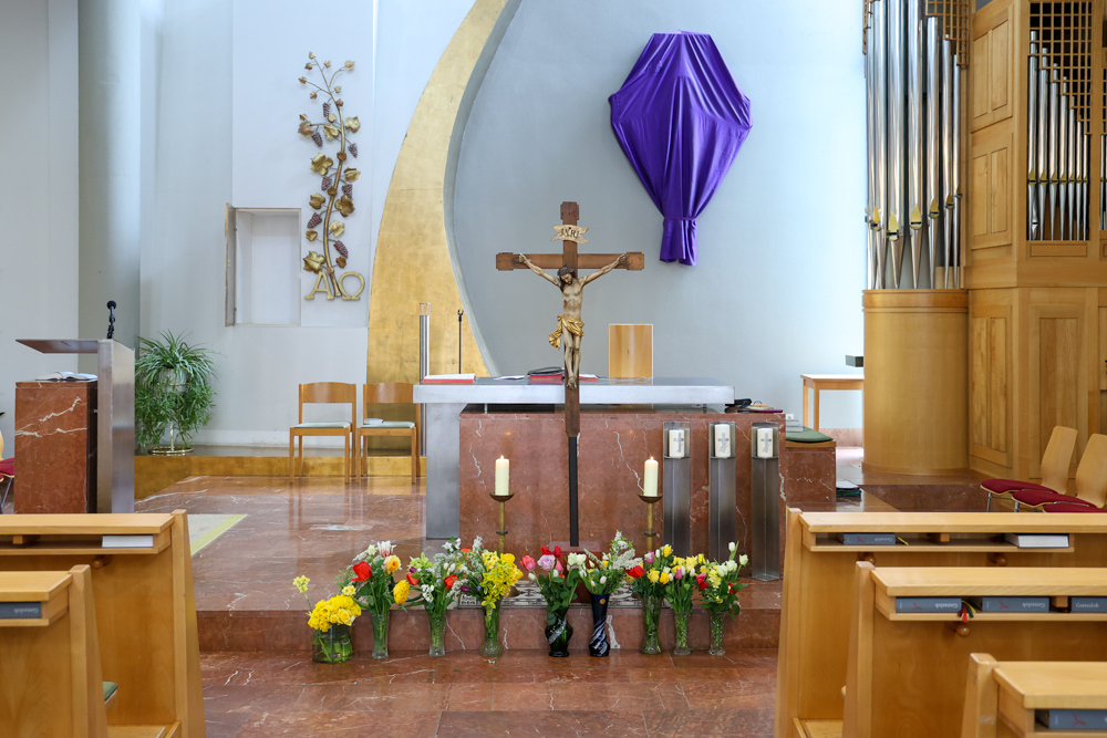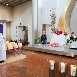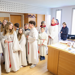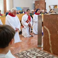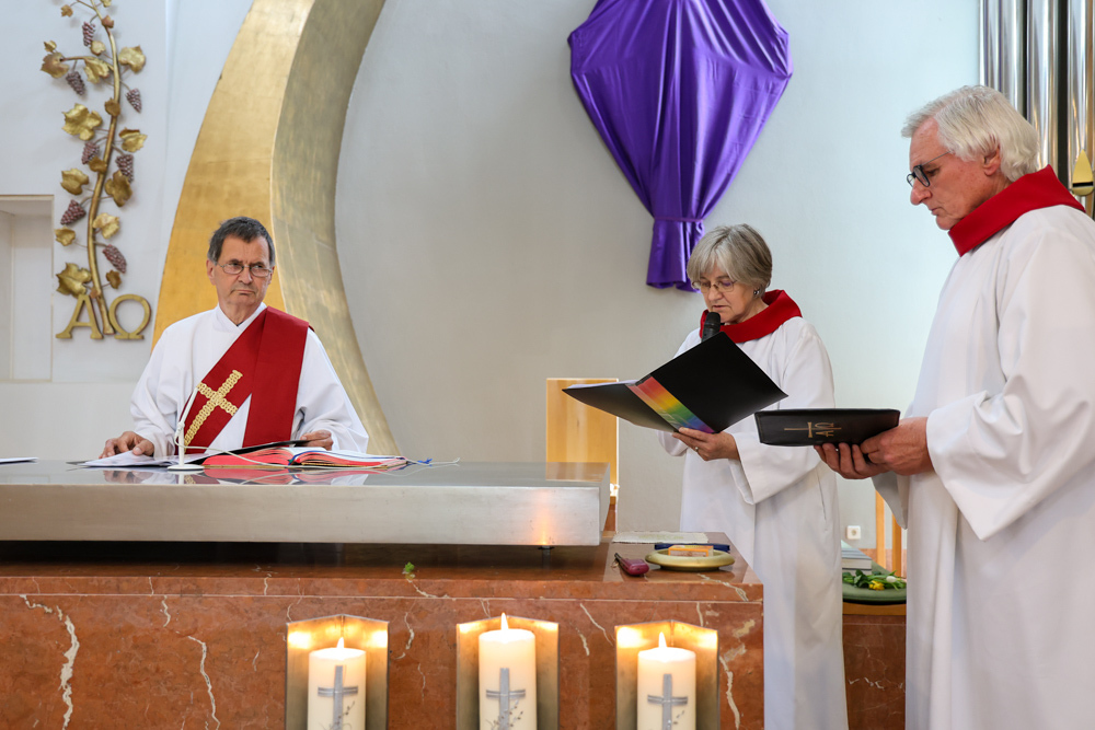 Die Leidensgeschichte wurde von den Ministrantinnen und Ministranten in verteilten Rollen gelesen. Nach der Enthüllung des Kreuzes waren alle eingeladen, dieses mit einer Kniebeuge und einer Blume zu verehren.