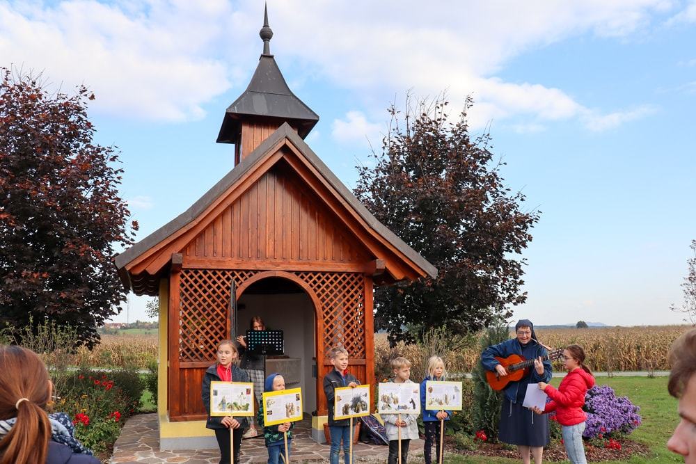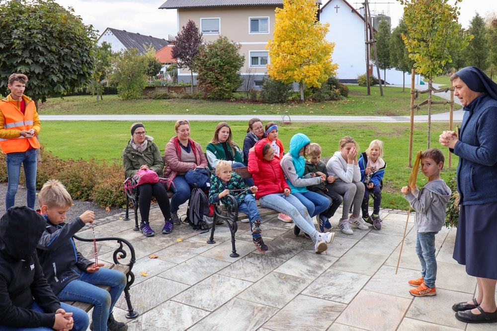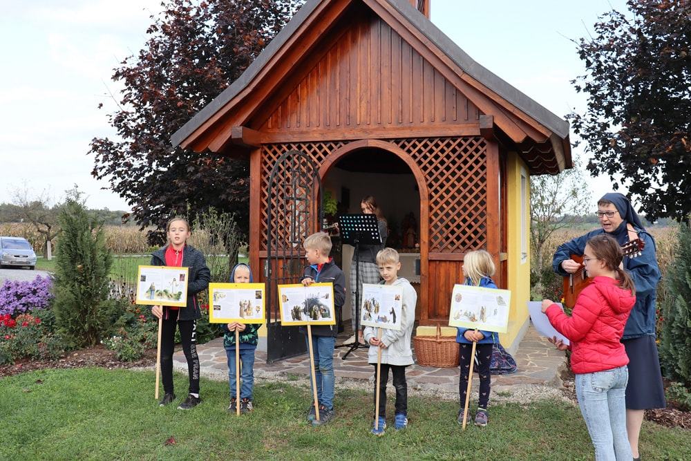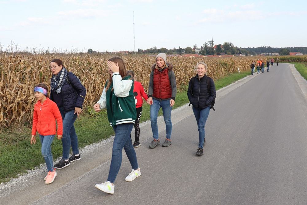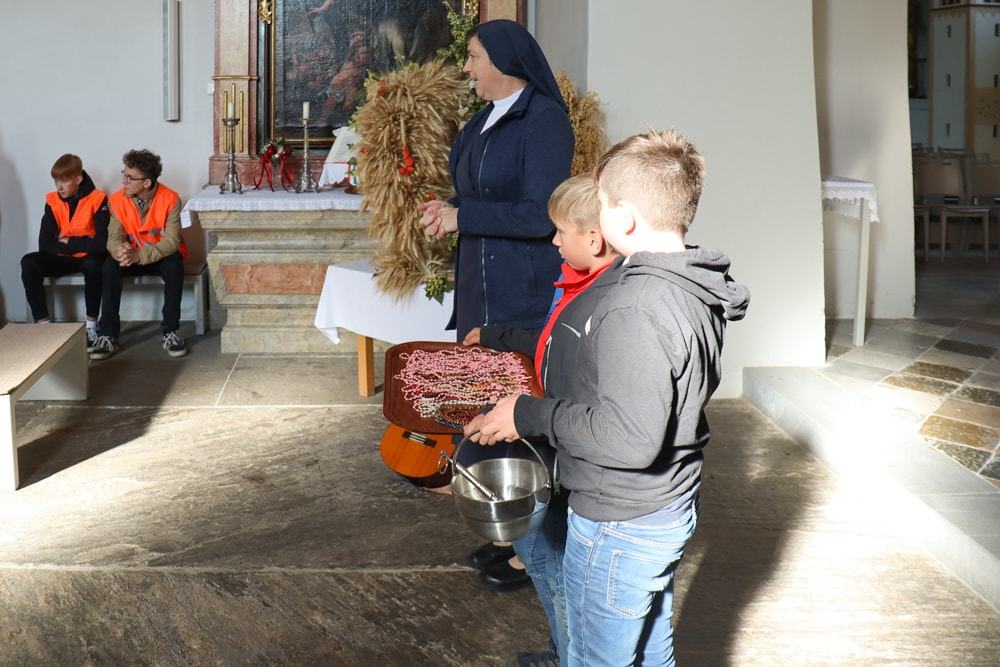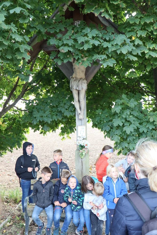 Anschließend wurden Kinder und Eltern in der Pfarrkirche auf Wallfahrt gesendet – Thema war heuer der freudenreiche Rosenkranz und so hatte jedes Kind auch einen eignen Rosenkranz dabei. Über den Oberberg weiter zur Dobl-Dorf-Kapelle und weiter zum Winkelhof führte uns unser Weg. Am Winkelhof durften wir dann zum Abschluss gemeinsam feiern.