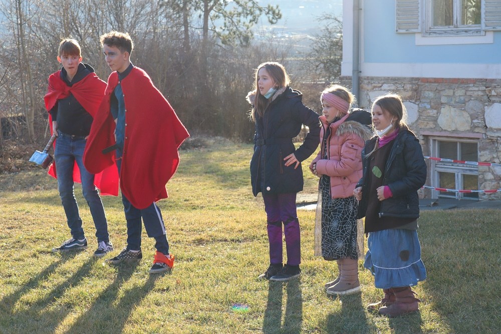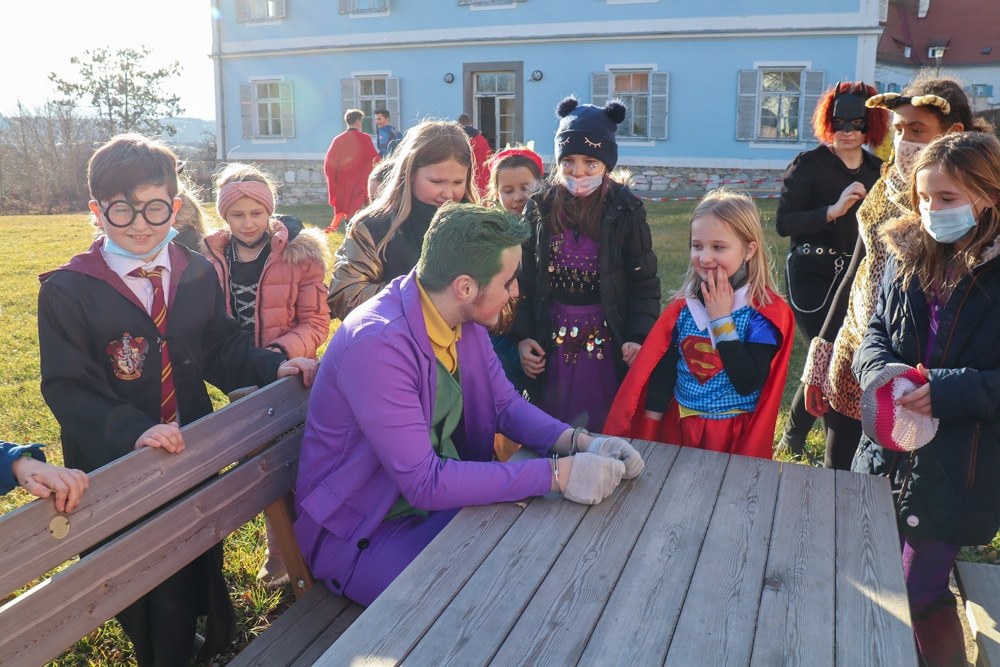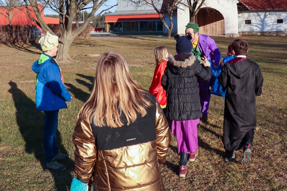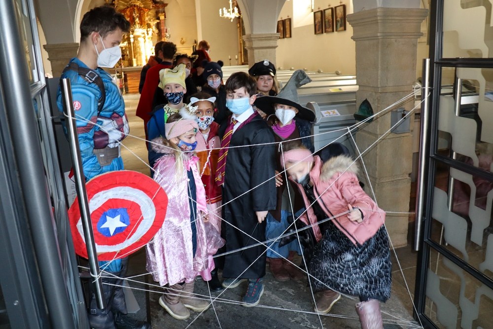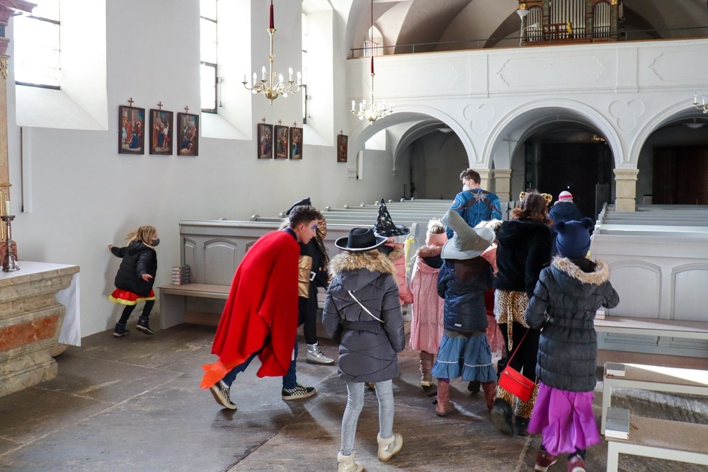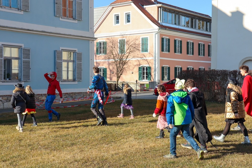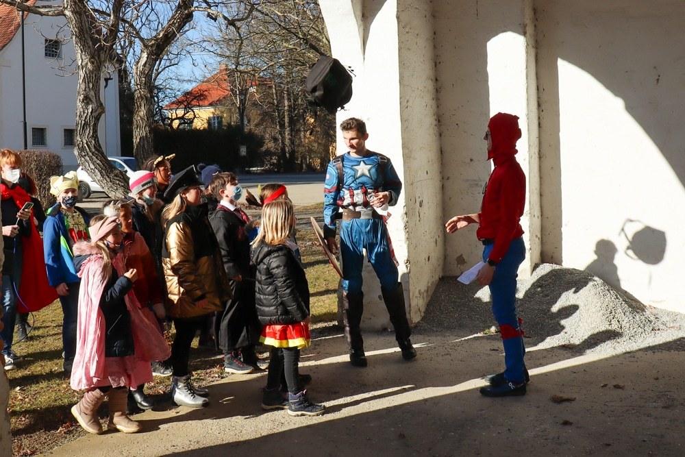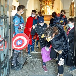Gemeinsam verfolgten sie den Dieb rund um und in der Kirche, im Schlosshof, im Pfarrhof und schlussendlich auch noch auf der Pfarrwiese. Dabei mussten sie einige Hindernisse überwinden und Rätsel lösen.