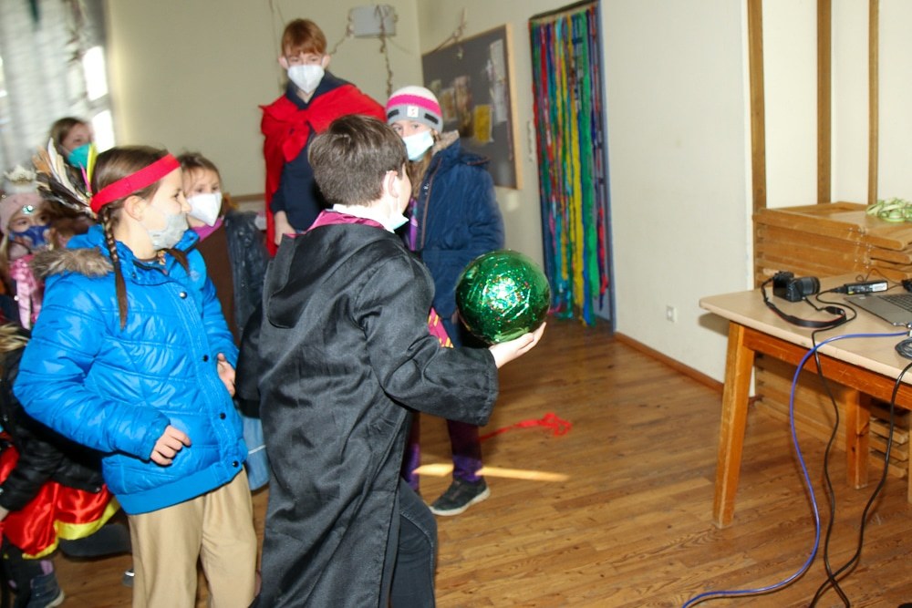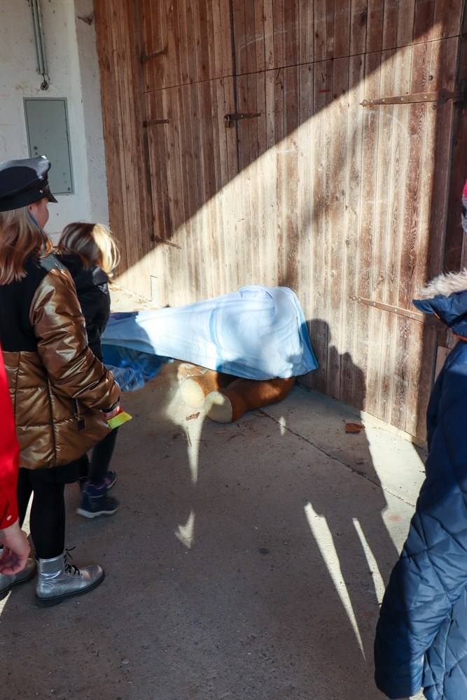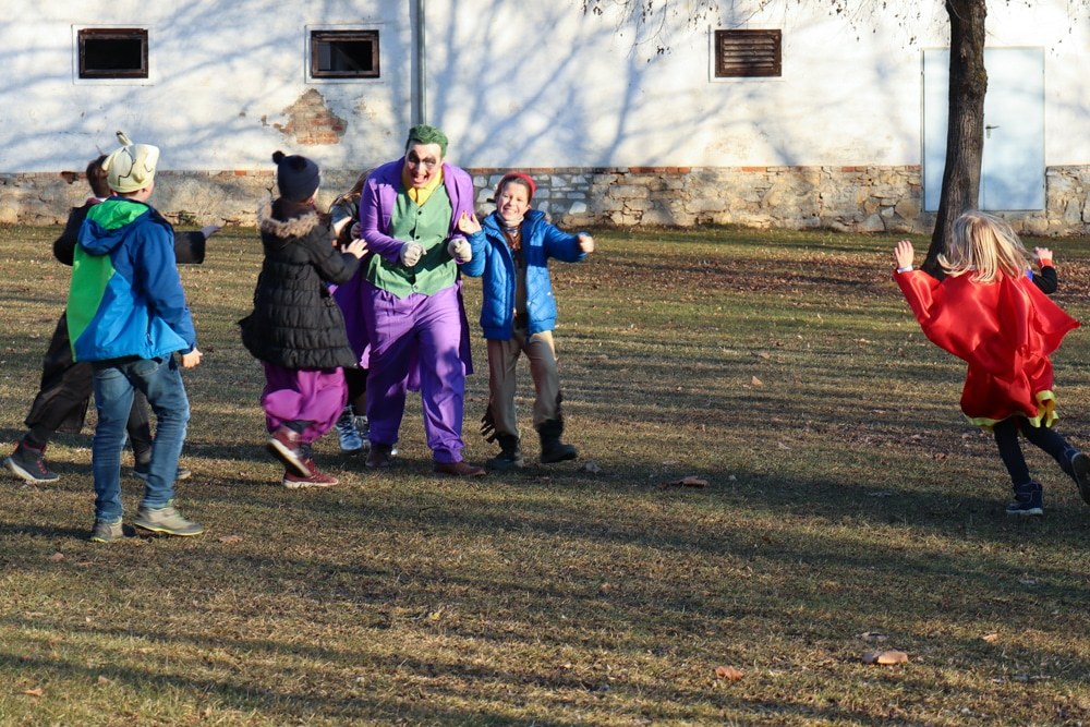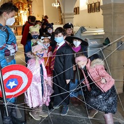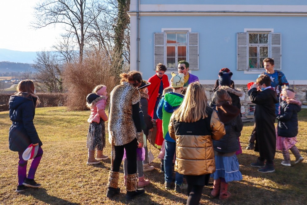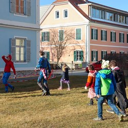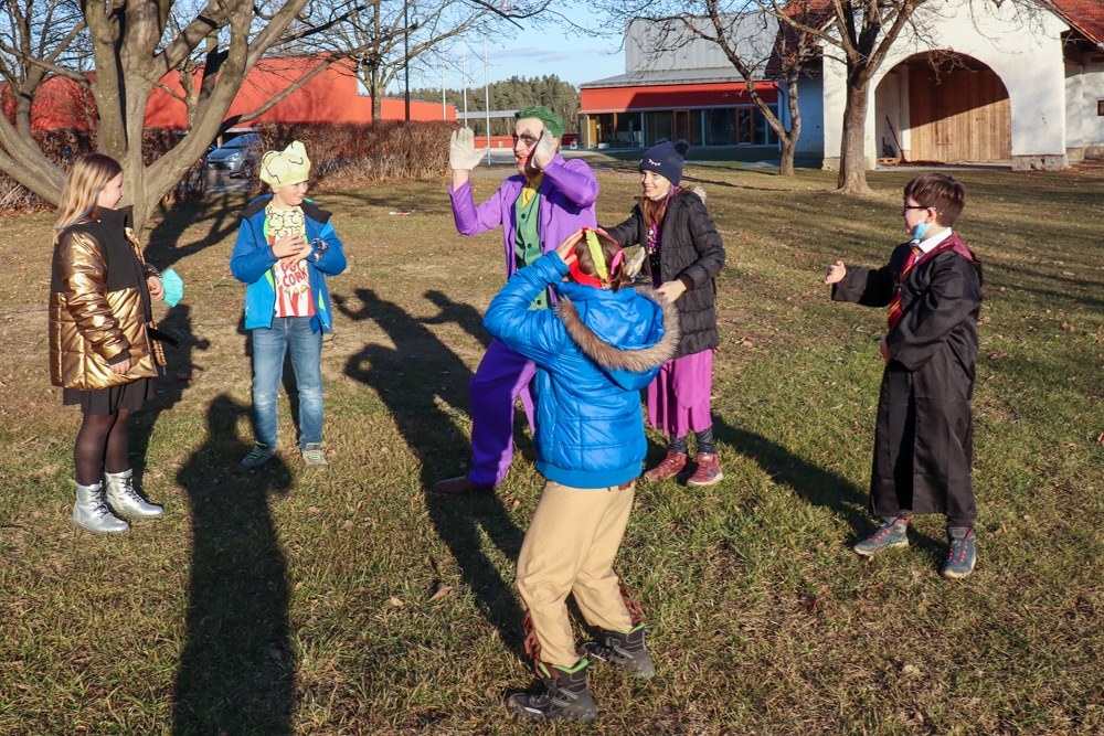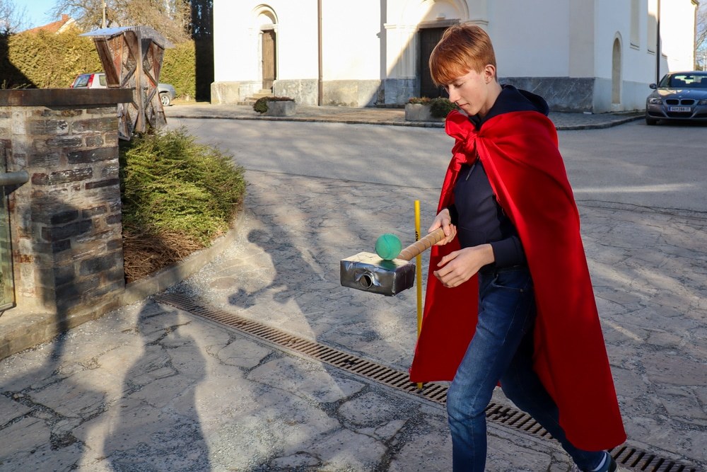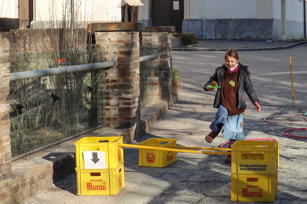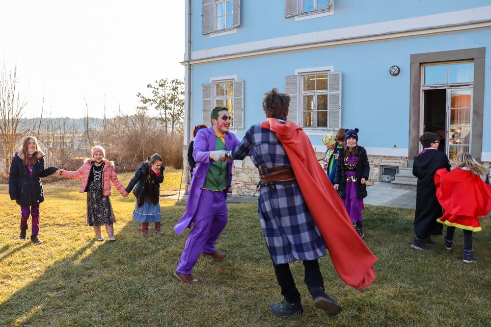 Gemeinsam verfolgten sie den Dieb rund um und in der Kirche, im Schlosshof, im Pfarrhof und schlussendlich auch noch auf der Pfarrwiese. Dabei mussten sie einige Hindernisse überwinden und Rätsel lösen.