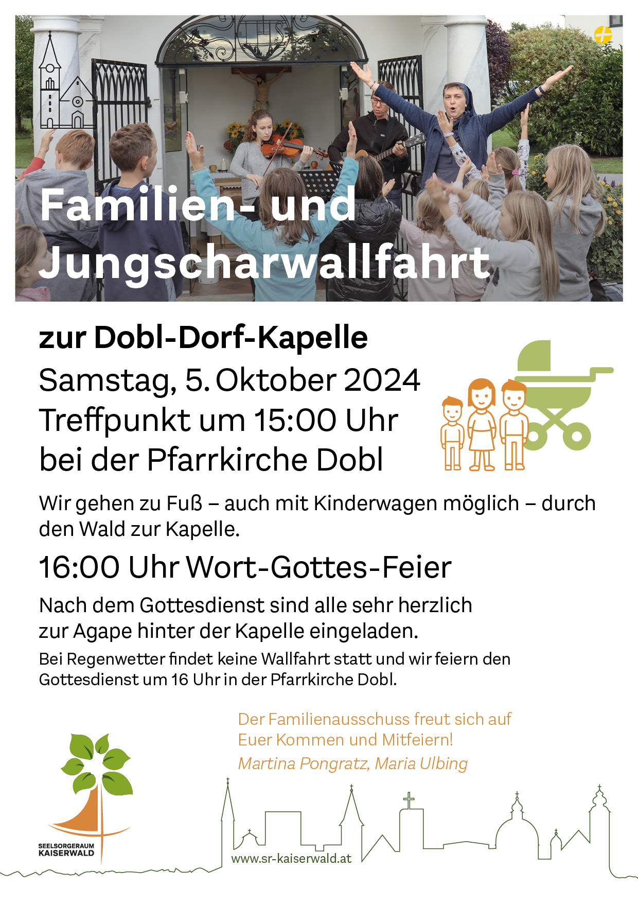 Treffpunkt um 15 Uhr bei der Pfarrkirche. Wir gehen zu Fuß – auch mit Kinderwagen möglich – durch den Wald zur Kapelle. Dort um 16:00 Uhr Wort-Gottes-Feier. Nach dem Gottesdienst sind alle sehr herzlich zur Agape hinter der Kapelle eingeladen. Bei Regenwetter findet keine Wallfahrt statt und wir feiern den Gottesdienst um 16 Uhr in der Pfarrkirche Dobl.
